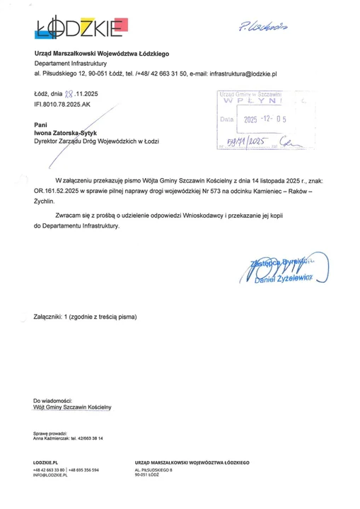Urząd Marszałkowski Województwa Łódzkiego poinformował, że wniosek wójt gminy Szczawin Kościelny został przekazany do dyrektora Zarządu Dróg Wojewódzkich w Łodzi.