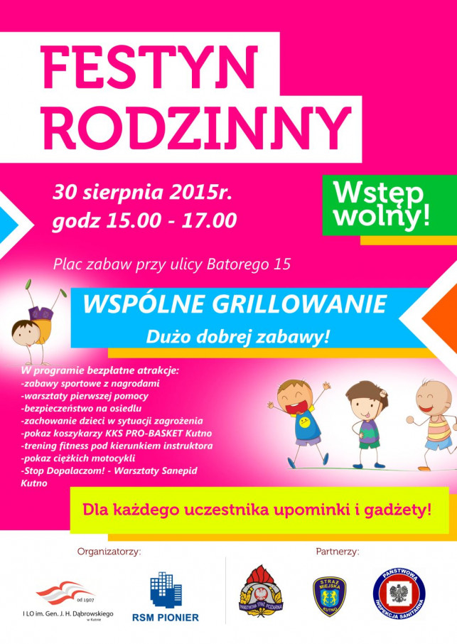 30 sierpnia w godzinach 15-17 odędzie się Festyn Rodzinny na placu zabaw przy ulicy Batorego 15.