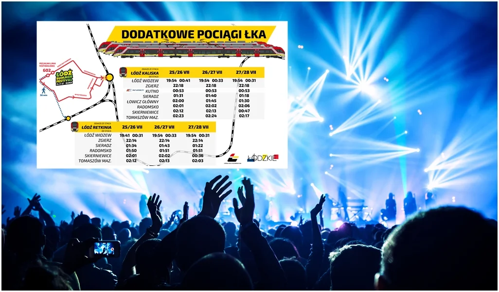 Od piątku do niedzieli ŁKA uruchamia aż 16 dodatkowych pociągów dziennie, Pojadą m.in. na trasach do Pabianic, Zgierza, Łasku, Radomska, Łowicza czy Kutna. Połączenia zostały dopasowane do godzin rozpoczęcia i zakończenia koncertów.