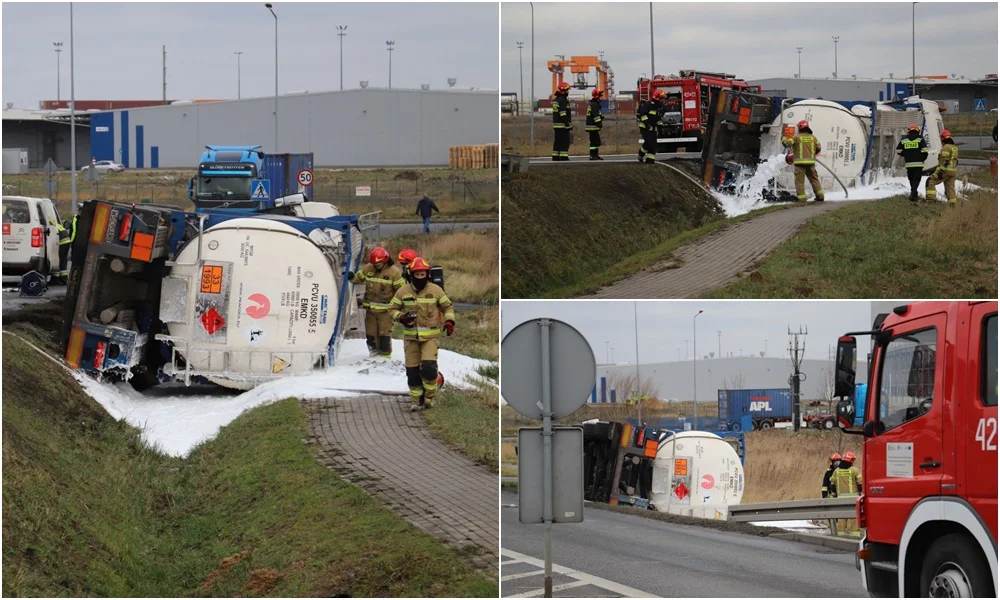 Z nieznanych na chwilę obecną przyczyn samochód ciężarowy z cysterną przewrócił się i wpadł do rowu. Doszło do wycieku rozpuszczalnika. Jeden zjazd z ronda jest całkowicie zablokowany.