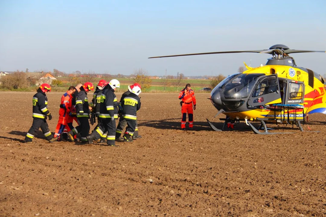 Poszkodowany został rolnik. Mężczyzna, jadąc ciągnikiem, wychylił się z pojazdu i został pochywacony przez maszynę rolniczą za kawałek ubrania, po czym spadł z traktora i uderzył głową o maszynę.