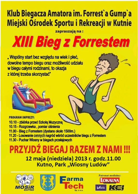 Klub Biegacza Amatora im. Forrest'a Gump'a oraz Miejski Ośrodek Sportu i Rekreacji w Kutnie zapraszają na XIII Bieg z Forrestem. Odbędzie się on w niedzielę, 12 maja o godzinie 11:00.