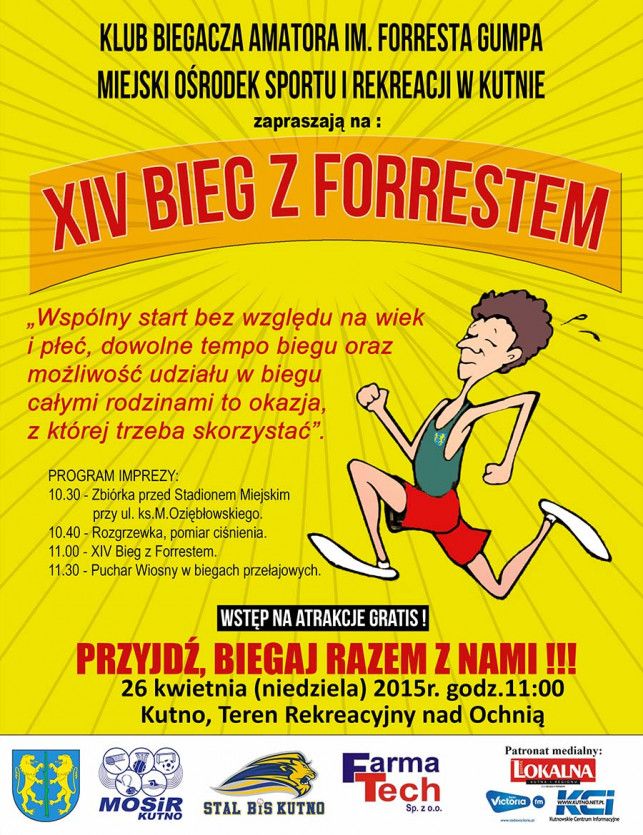 WydarzeniaKlub Biegacza Amatora im. Forresta Gumpa i Miejski Ośrodek Sportu i Rekreacji w Kutnie zapraszają mieszkańców Kutna na XIV Bieg z Forrestem, który odbędzie się 26 kwietnia 2015 roku o godz. 11:00 na terenach rekreacyjnych nad Ochnią.Wspólny start bez względu na wiek i płeć, dowolne tempo oraz możliwość udziału w biegu całymi rodzinami, to okazja z której trzeba skorzystać.- Zależy nam na tym, aby impreza promująca zdrowy styl życia, a przecież "Bieg z Forrestem" ma taki właśnie symboliczny charakter, była jak do tej pory swoistym piknikiem, na którym pojawią się nie tylko biegający, ale i ich rodzice, dziadkowie, rodzeństwo, że będzie to przedpołudnie spędzone na świeżym powietrzu w scenerii terenów rekreacyjnych nad Ochnią, pełne atrakcji dla dzieci, będzie kiełbaska z grilla, a zawodnicy "MKS Stal BiS" Kutno aktualnego mistrza Polski w baseballu, przybliżą nam arkana tej ciekawej gry - powiedział dyrektor MOSiR Paweł Ślęzak.