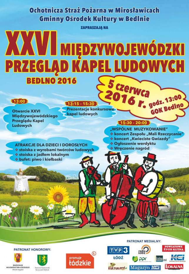 Ochotnicza Straż Pożarna w Mirosławicach, Gminny Ośrodek Kultury w Bedlnie zapraszają na XXVI Międzywojewódzki Przegląd Kapel Ludowych Bedlno 2016.