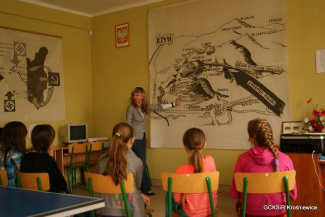 Młodzi ludzie z właściwym sobie entuzjazmem wysłuchali ciekawostek historycznych, obejrzeli mini ekspozycję, zgromadzoną w pomieszczeniach Świetlicy. Przed budynkiem, przy tablicy poświęconej żołnierzom 2 Korpusu Polskiego i jego Dowódcy zapalili znicz, zrobili zdjęcia. Nie omieszkali też dokonać wpisu w Księdze Pamiątkowej. Ale to nie koniec wycieczkowych atrakcji.