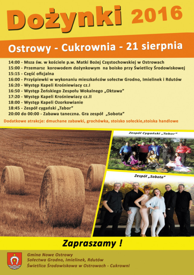 21 sierpnia w Ostrowach-Cukrownia odbędą się dożynki gminne. Uroczystość rozpocznie się mszą św. w kościele p.w. Matki Bożej Częstochowskiej w Ostrowach o godzinie 14, zaś zakończy o godzinie 24. Zagra m.in. zespół "Tabor" oraz "Sobota".