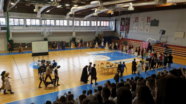 Szkolne uroczystości klas IV – VIII rozpoczęły się od przywitania gości przez króla i królową oraz p. wicedyrektor Elżbietę Mikołajczyk. Uczniowie przebrani za reprezentantów poszczególnych średniowiecznych grup społecznych zaprezentowali się w korowodzie.