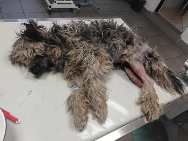 Jak dodają, pies przebywał przez dłuższy czas w tym samym miejscu. Był bezdomny i dokarmiany przez mieszkańców z okolicy. Poza krwiakami i ranami po pobiciu piesek był w opłakanym stanie. Zamiast sierści miał dredy, pełno pcheł i kleszczy.