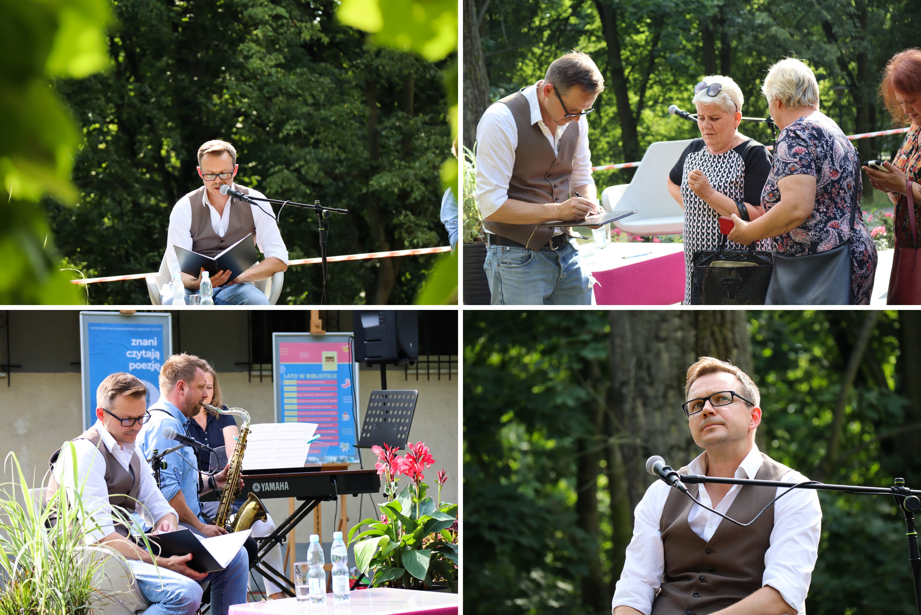 Spotkanie rozpoczęło się 11 lipca o godz. 16:00 przed kutnowską biblioteką. Klimatu do recytacji dostarczała sama natura w postaci odgłosów ptaków z pobliskiego parku, a także muzyka w wykonaniu Pawła Zielaka - saksofonisty, kompozytora, aranżera i pedagoga. Na instrumencie klawiszowym akompaniowała Beata Stanisławska Zielak - na co dzień związana z Państwową Szkołą Muzyczną I i II st. im. Ignacego J. Paderewskiego w Koninie. W ich wykonaniu usłyszeliśmy utwory z bogatego repertuaru Zbigniewa Wodeckiego. Było niezwykle klimatycznie i nastrojowo.