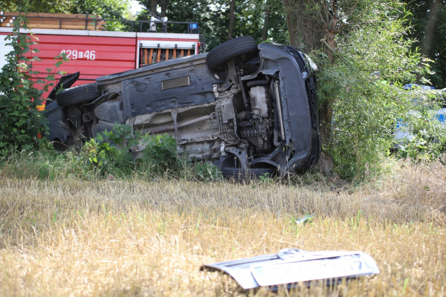 Jak się dowiadujemy, autem podróżowały dwie osoby. Jeden mężczyzna został zakleszczony w pojeździe, drugi wypadł przez szybę i wylądował w polu, kilkanaście metrów dalej.