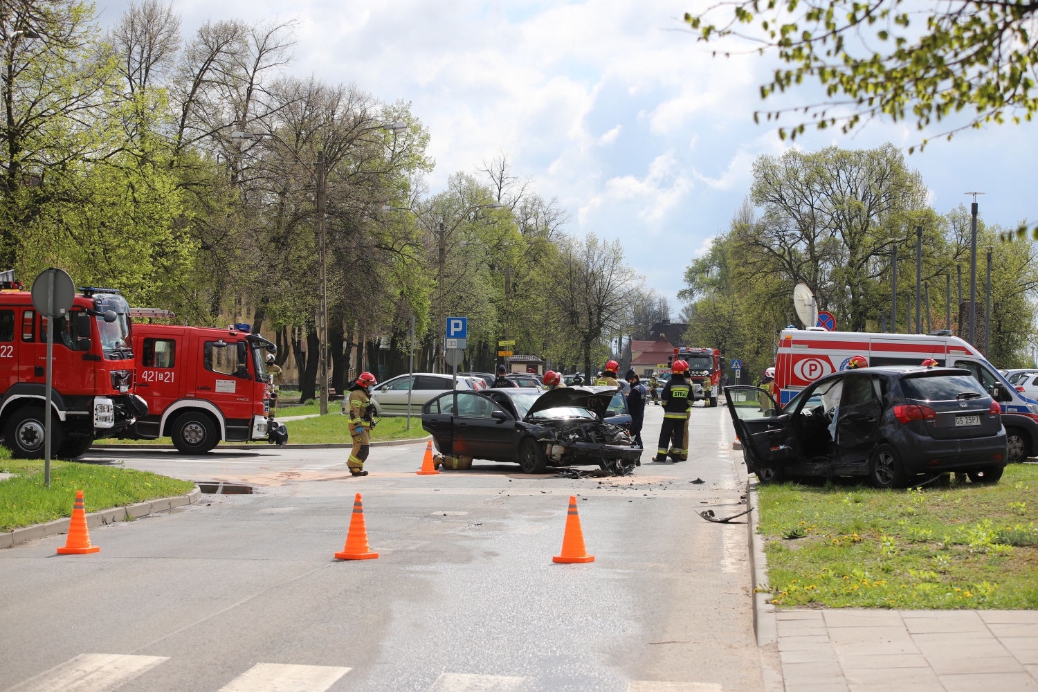 W nieznanych na chwilę obecną okolicznościach zderzyły się ze sobą dwa auta osobowe: ford na kutnowskich numerach rejestracyjnych i kia na gostynińskich "blachach". Dwie osoby były zakleszczone w pojeździe, strażacy musieli użyć specjalistycznego sprzętu, by wydostać poszkodowanych.