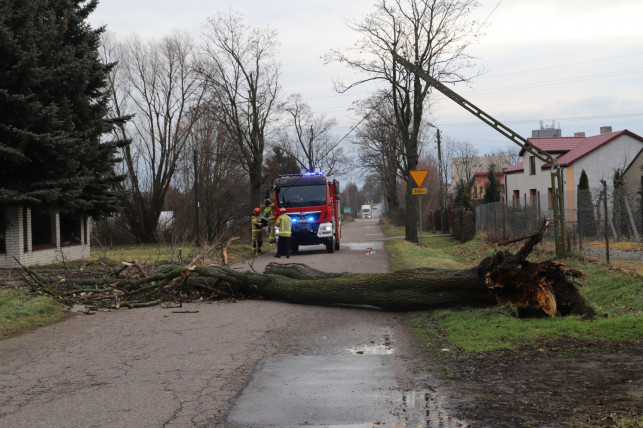 Około godz. 8.30 kutnowskich strażaków wezwano do miejscowości Woźniaków, gdzie drzewo runęło na drogę całkowicie ją blokując. Uszkodzona została również linia energetyczna. Zadysponowano tam jeden zastęp z JRG Kutno. Działania strażaków w tym miejscu nadal trwają.