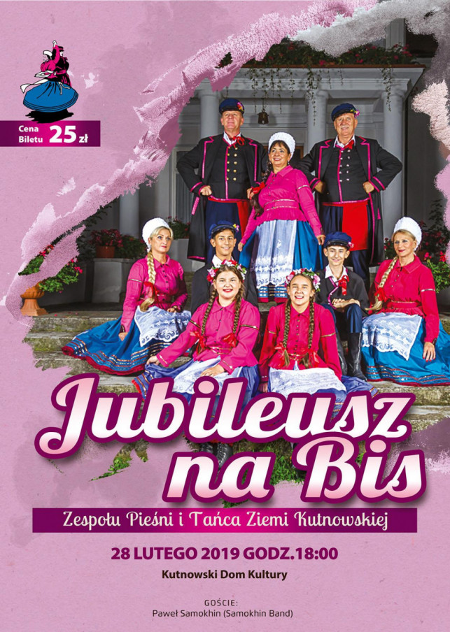 Gala jubileuszowa Zespołu Pieśni i Tańca Ziemi Kutnowskiej odbędzie się 28 lutego o godz. 18 w sali widowiskowej Kutnowskiego Domu Kultury. Bilety w cenie 25 zł dostępne w kasie KDK/CTMiT lub online: www.bilety.kdk.net.pl. Gościem będzie Pavel Samokhin (Samokhin Band).