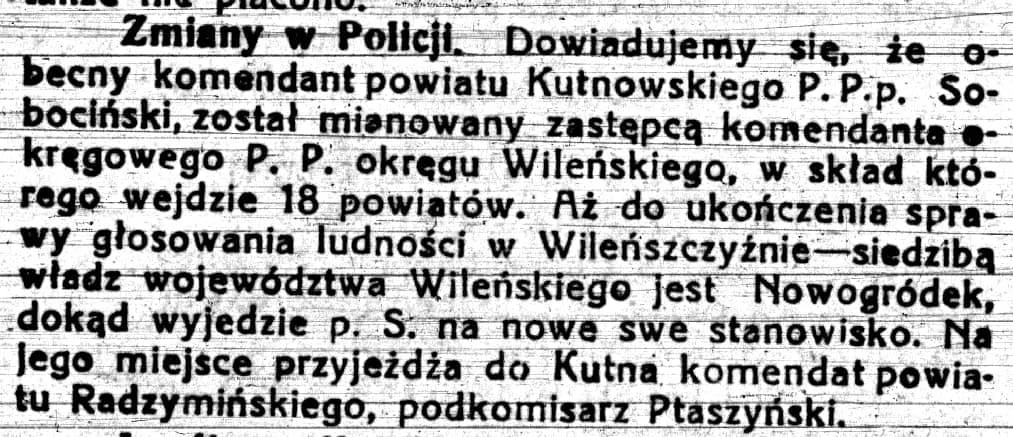 Dowiadujemy się, że obecny komendant powiatu Kutnowskiego P. P. P. Soboński, został mianowany zastępcą komendanta okręgowego P. P. okręgu Wileńskiego, w skład którego wejdzie 18 powiatów [...] Na jego miejsce przyjeżdża do Kutna komendant powiatu Radzymińskiego, podkomisarz Ptaszyński.