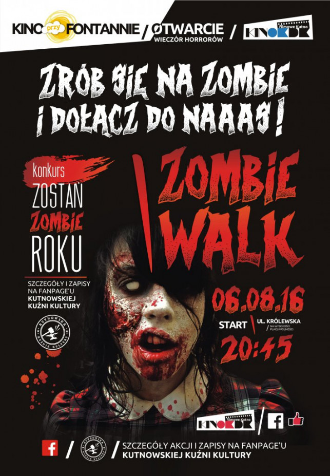 Zaczynamy od "Zombie walk" - akcji organizowanej przez stowarzyszenie Kutnowska Kuźnia Kultury. Zombie wyruszają o 20:45 z ul. Królewskiej (na wysokości Placu Wolności) na Plac Piłsudskiego. Jeśli chcecie do nas dołączyć, wyślijcie wiadomość do Kuźni na facebook.