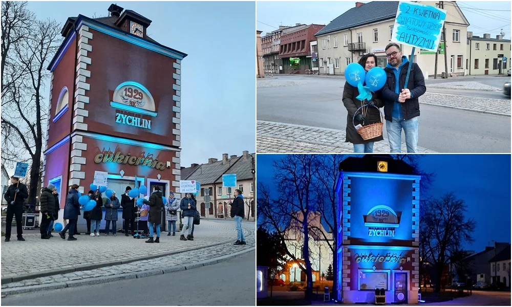 W godz. 19-21 na znak solidarności i pamięci z osobami dotkniętymi spectrum autyzmu, w centrum Żychlina podświetlono „zegar” na niebiesko.